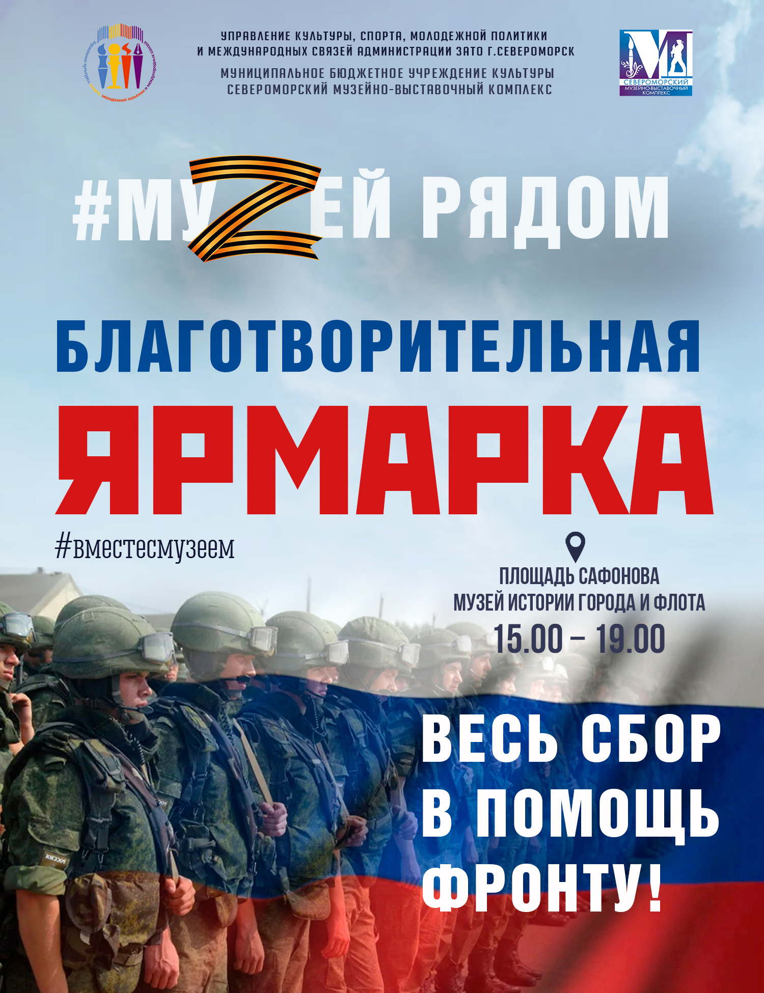 С 15 часов перед входом в Музей на улице Сафонова, д.15 − благотворительная ярмарка изделий декоративно-прикладного творчества, выставка-продажа живописи и концертная программа творческих коллективов.. В самом музее вас ждут тематические экскурсии и фотозона в «Комнате советского офицера».