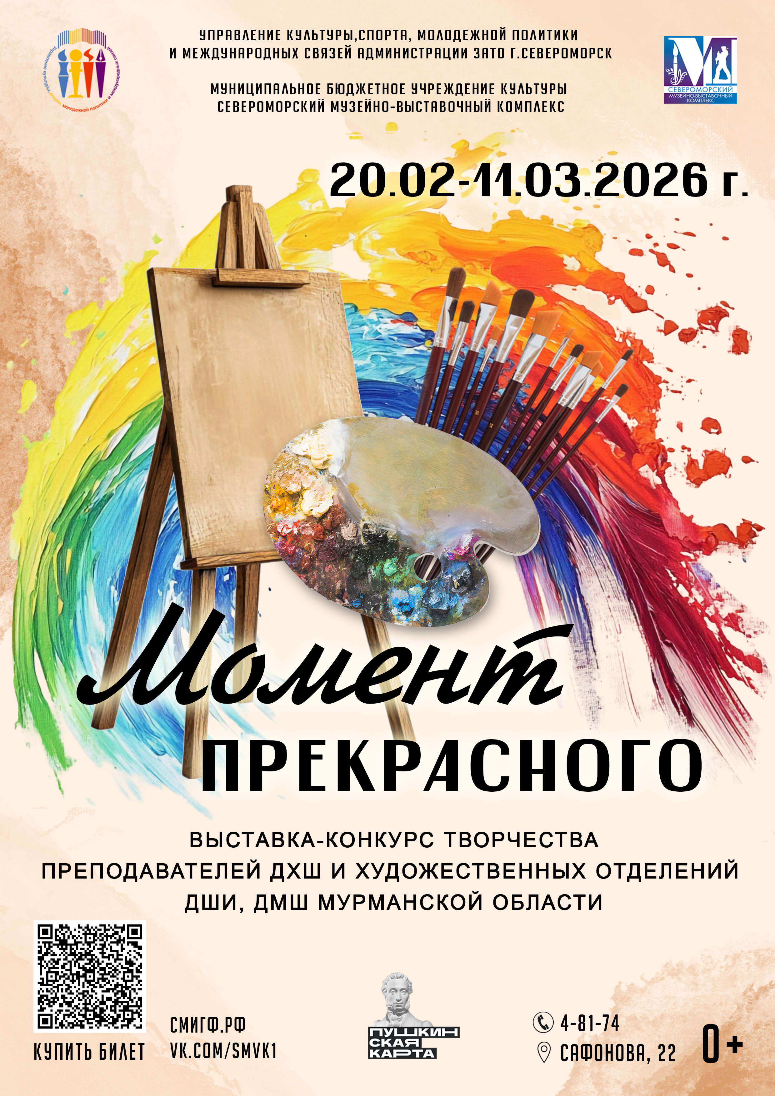 20 февраля в Выставочном зале СМВК (ул. Сафонова, д. 22) начала работать выставка 1-го Открытого городского конкурса творчества преподавателей ДХШ и художественных отделений ДШИ, ДМШ Мурманской области «Момент прекрасного». Гости Выставочного зала смогут познакомиться с творчеством преподавателей ЗАТО г. Североморск, г. Мурманска и г. Полярный.