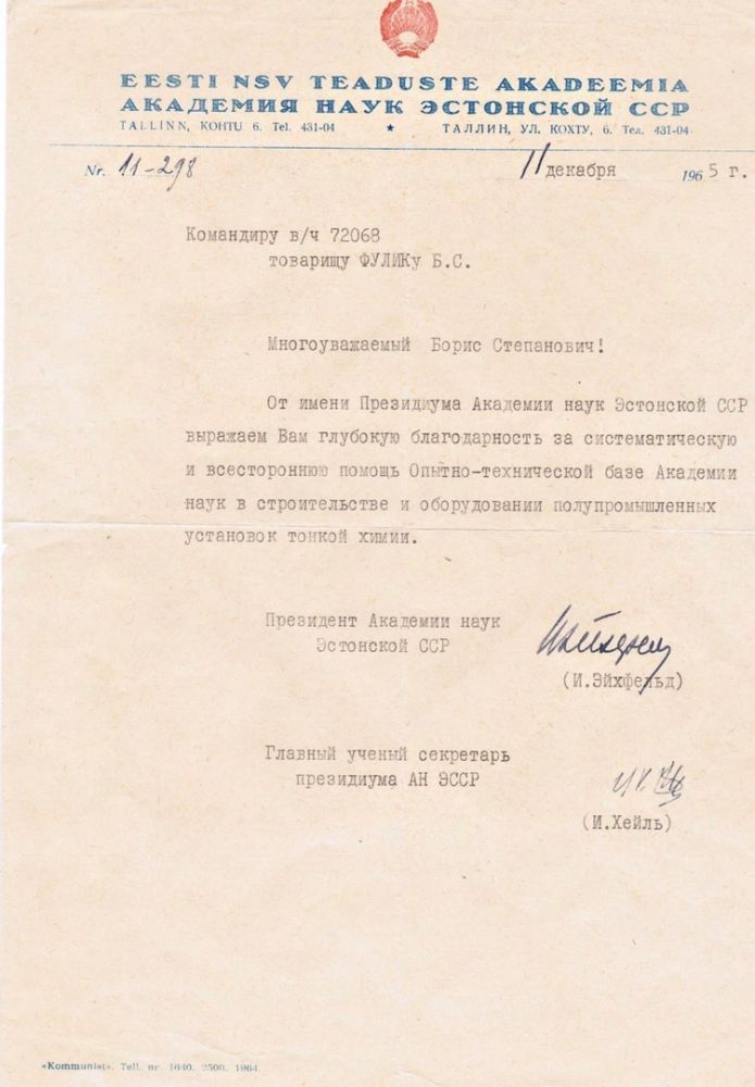 Письмо президента Академии наук Эстонской ССР И.Эйхфельда Б.С. Фулику