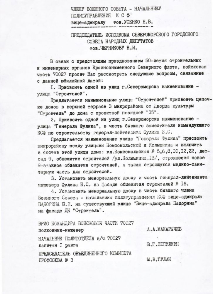 Вернёмся к истории столицы Северного флота. Большинство жилых, бытовых и служебных зданий в нашем городе были сооружены руками рядовых военных строителей. Лучшие из них удостоены почетного звания “Заслуженный строитель СССР”. И как знак огромного уважения и памяти о мужественных людях, возводивших на суровом Севере города, строивших стратегические военные объекты, в верхней части города на улице адмирала Падорина, у бывшего здания СВМС, расположен памятник строителям Северного флота работы Тагира Хайрова.