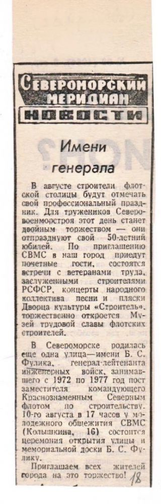 Через 7 лет Фулик попадает на Северный флот и назначается заместителем командующего по строительству. Он с головой уходит в работу. Его редко можно застать в кабинете. Генерал скрупулёзно изучает и решает флотские строительные проблемы. Так, вместо старого мало производственного эстакадного метода забивки свай внедряется вибрационный способ с плавкранов. В практику строительства входит универсальная конструкция стационарных причалов на свайных оболочках. Это был принципиально новый метод строительства гидроакустических сооружений, которые возводились взамен устаревших. Производительность труда возросла в полтора раза, значительно повысилась эффективность строительного производства, придаётся значение крупноблочному строительству.