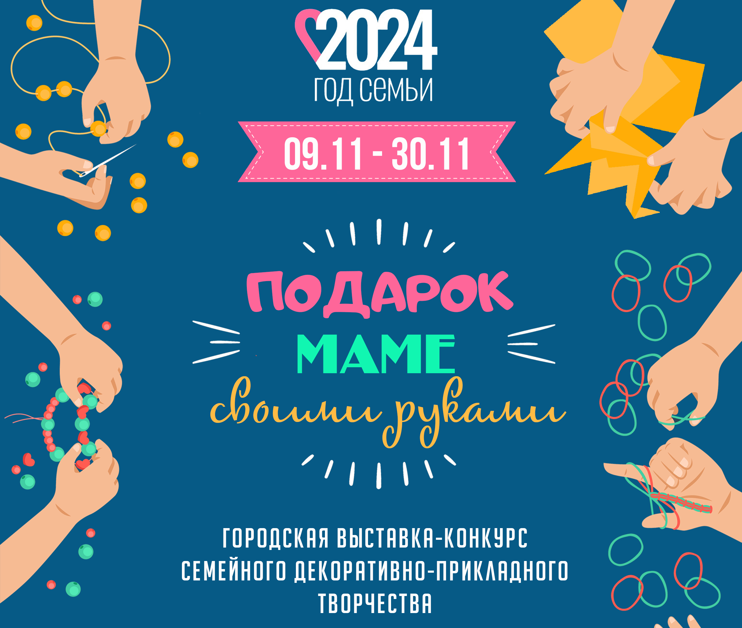 Отдел прикладного творчества и народных ремёсел Североморского музейно-выставочного комплекса приглашает творческие семьи Североморска, увлечённые декоративно-прикладным творчеством, принять участие в городской выставке-конкурсе «Подарок маме своими руками», посвящённой Дню матери, в рамках Года семьи.