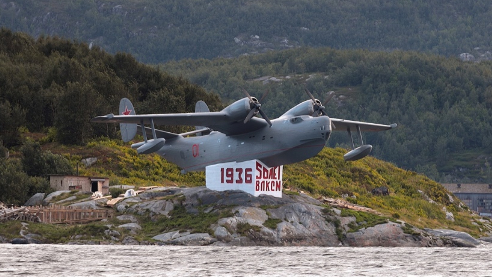 На бетонном постаменте с начертанными на нём цифрами «1936» и надписью "50 лет ВЛКСМ", установлен гидросамолёт, как напоминание о том, как в сентябре 1936 года, в трюмах кораблей, в разобранном виде, в Заполярье было доставлено первое звено из трёх гидросамолётов-разведчиков. Первым командиром звена был старший лейтенант Г.В. Степанов. Со временем на базе этого звена был образован морской разведывательный полк. В составе полка числился и этот самолёт, ставший впоследствии памятником. Первым его пилотом и командиром экипажа долгое время был Л.И. Анифер. После войны гидросамолёт выполнял полёты на ледовую разведку в Арктику. Последний полёт на нём был совершён в мае 1968 года, а через несколько месяцев он занял своё почётное место на постаменте.