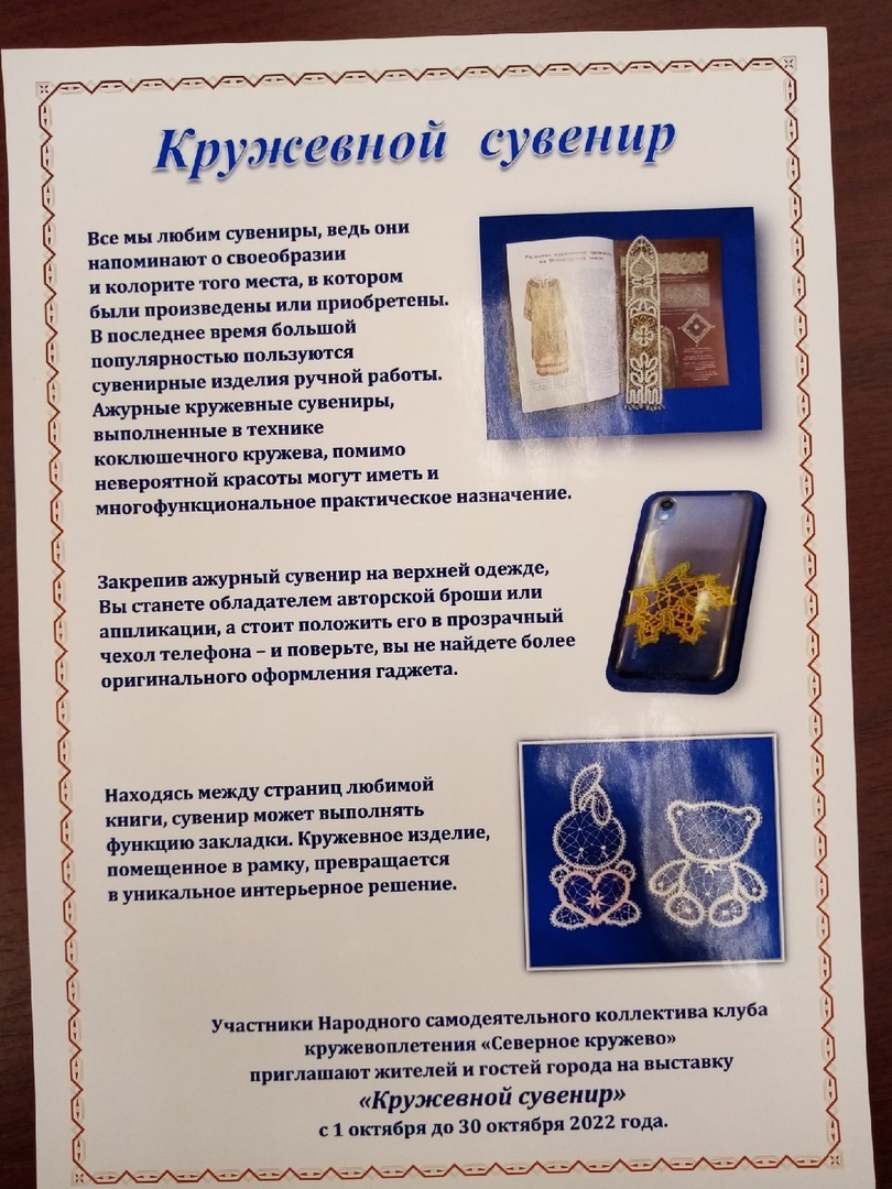 Участники Народного самодеятельного коллектива клуба кружевоплетения «Северное кружево» приглашают жителей и гостей города на выставку работ, выполненных в технике коклюшечного кружева, которая продолжит свою работу до 30 октября 2022 года.