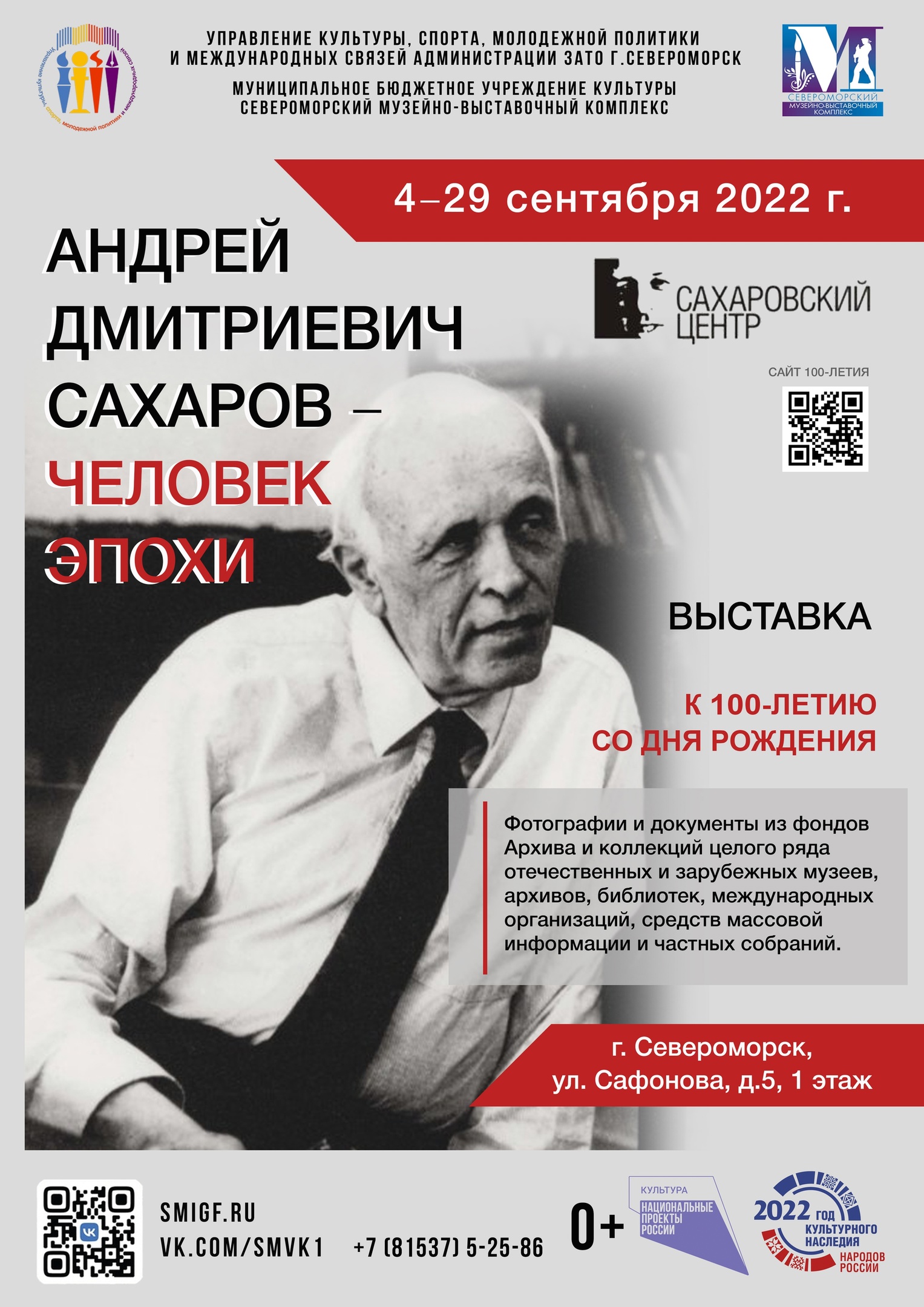 Передвижная фотовыставка подготовлена Архивом Сахарова. На ней представлены фотографии и документы из фондов Архива и коллекций целого ряда отечественных и зарубежных музеев, архивов, библиотек, международных организаций, средств массовой информации и частных собраний. Выставка состоит из 18 роллап планшетов. Выставка, построенная по хронологическому принципу, охватывает всю жизнь Сахарова, показывая основные аспекты его деятельности и основные события его биографии. Она позволяет окинуть одним взглядом важнейший период истории – то время, когда родился современный мир, и оценить ту роль, которую сыграл в этих процессах Андрей Дмитриевич Сахаров. Насыщенный информативный и иллюстрационный материал выставки, разделённый на тематические блоки, будет интересен всем, интересующимся историей нашей страны, и может послужить основой для дискуссий.