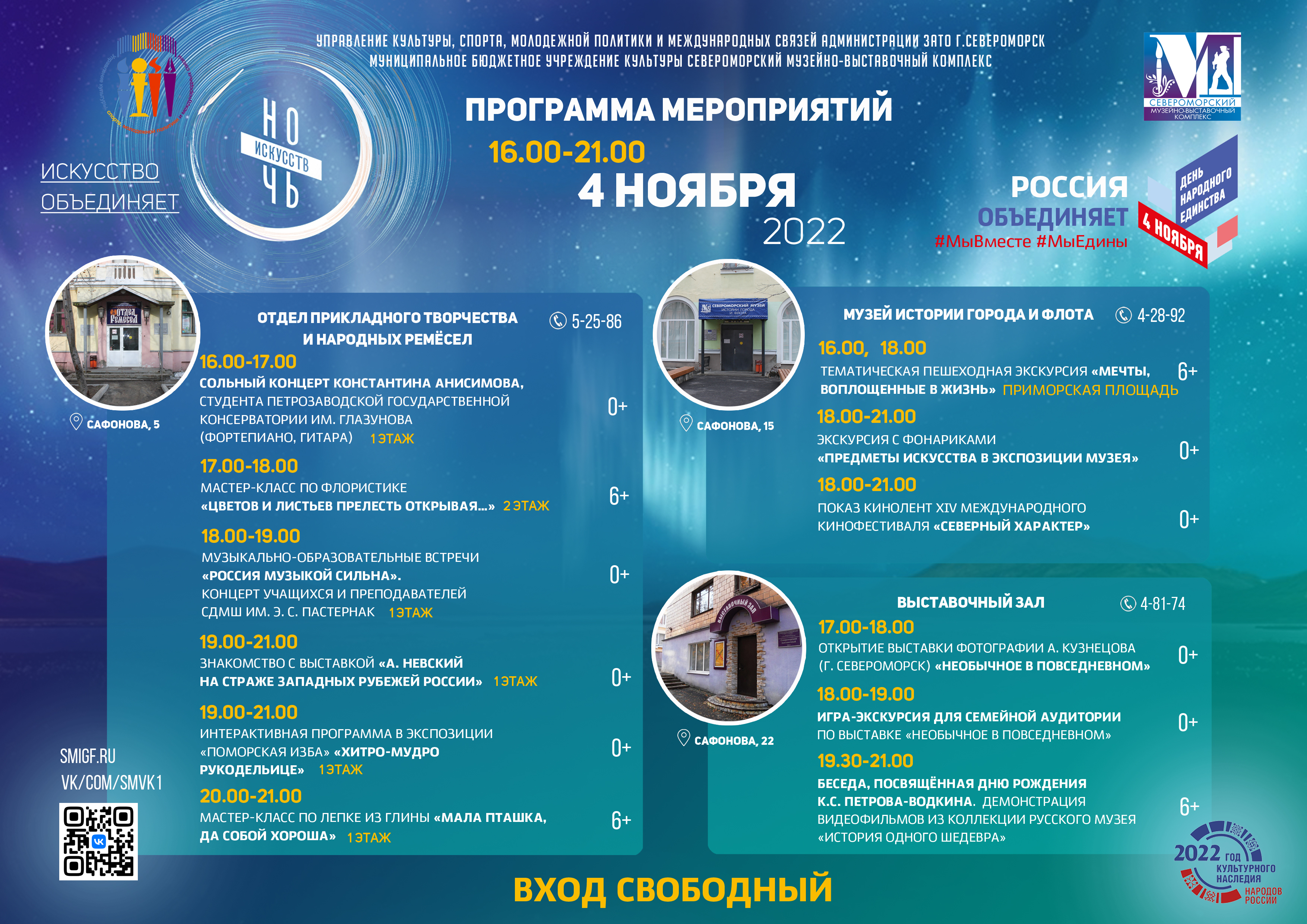 Предлагаем вашему вниманию программу культурно-образовательной акции «Ночь искусств», которая состоится 4 ноября с 16.00 до 21.00 в Североморском Музейно-выставочном комплексе.