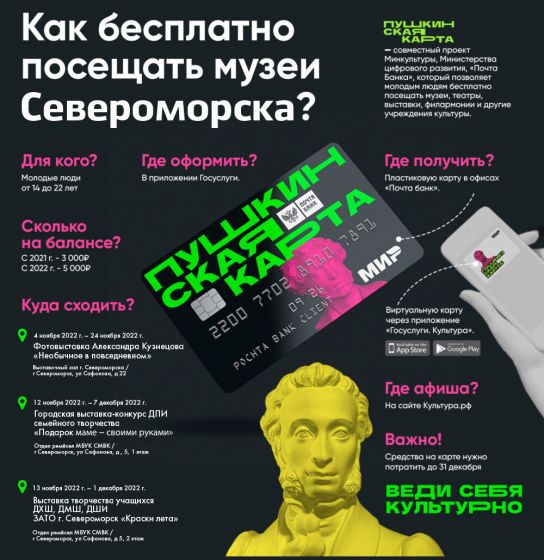 Североморский Музейно-выставочный комплекс является участником Всероссийской культурной программы «Пушкинская карта». Карта позволяет посещать платные культурные мероприятия, не тратя на это личные средства.