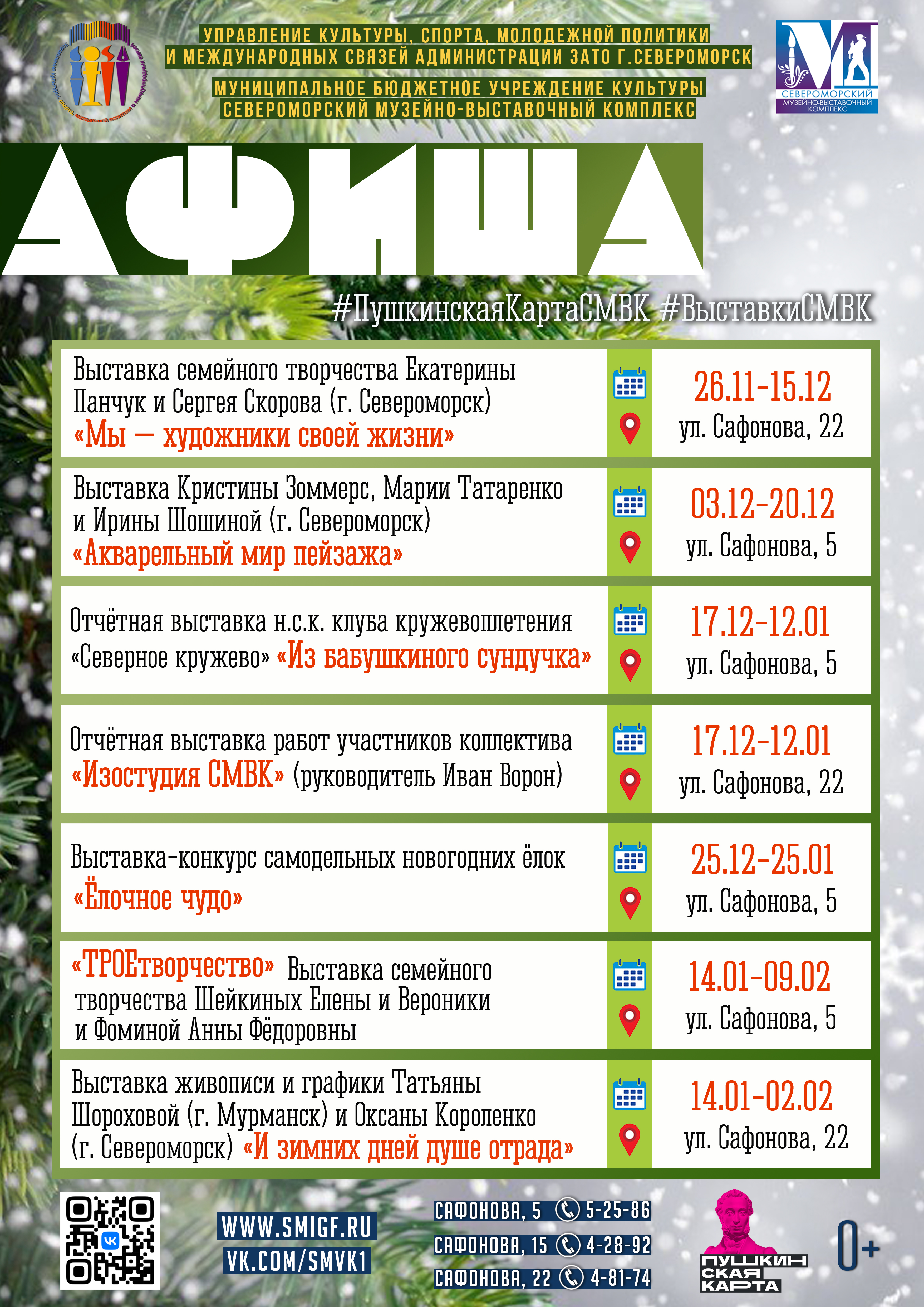 Дорогие друзья! Предлагаем вашему вниманию афишу выставок на декабрь 2022 года и январь 2023 года.