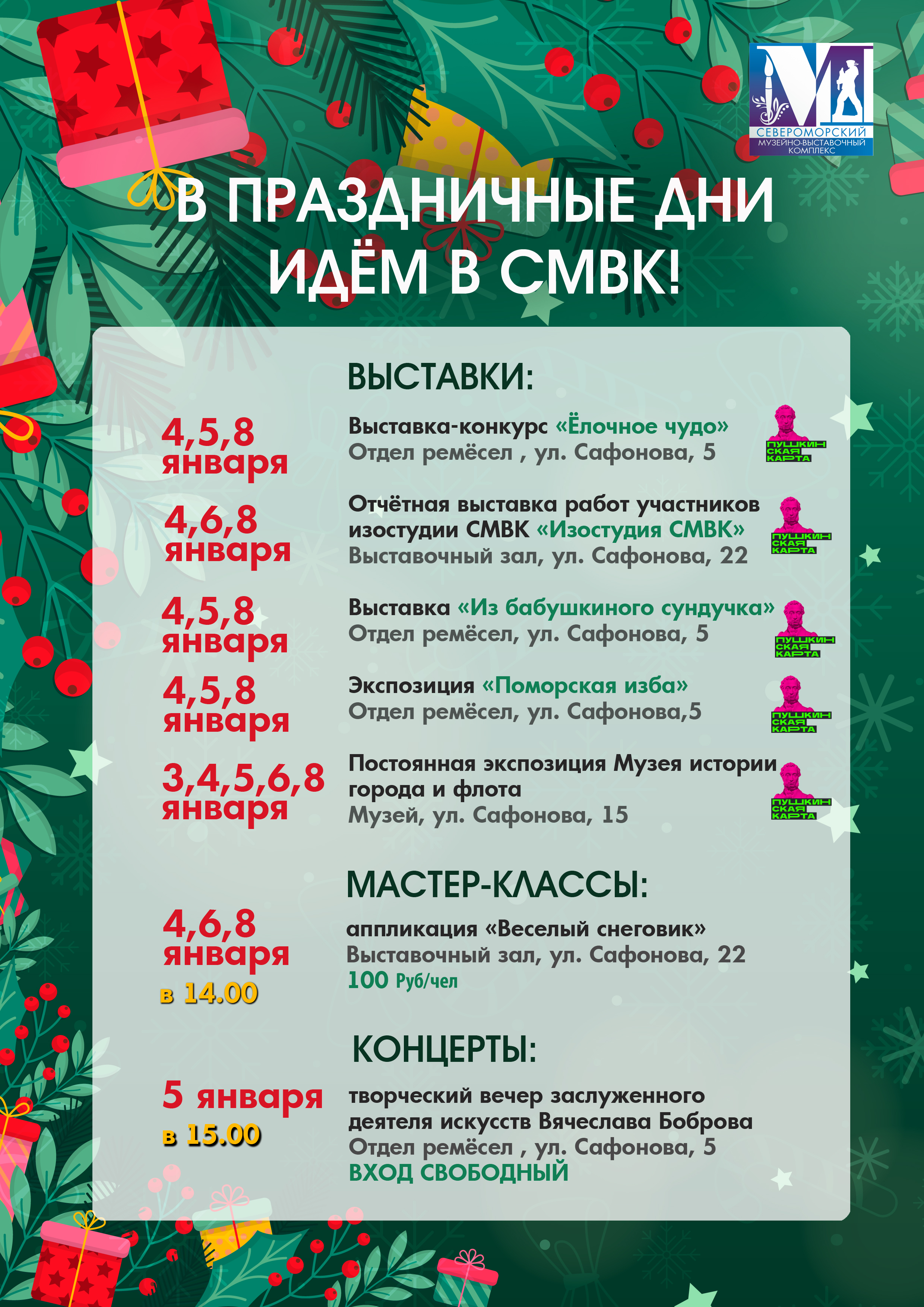 - творческий вечер заслуженного деятеля искусств Вячеслава Боброва (Отдел ремёсел , ул. Сафонова, 5) 5 января в 15.00. ВХОД СВОБОДНЫЙ