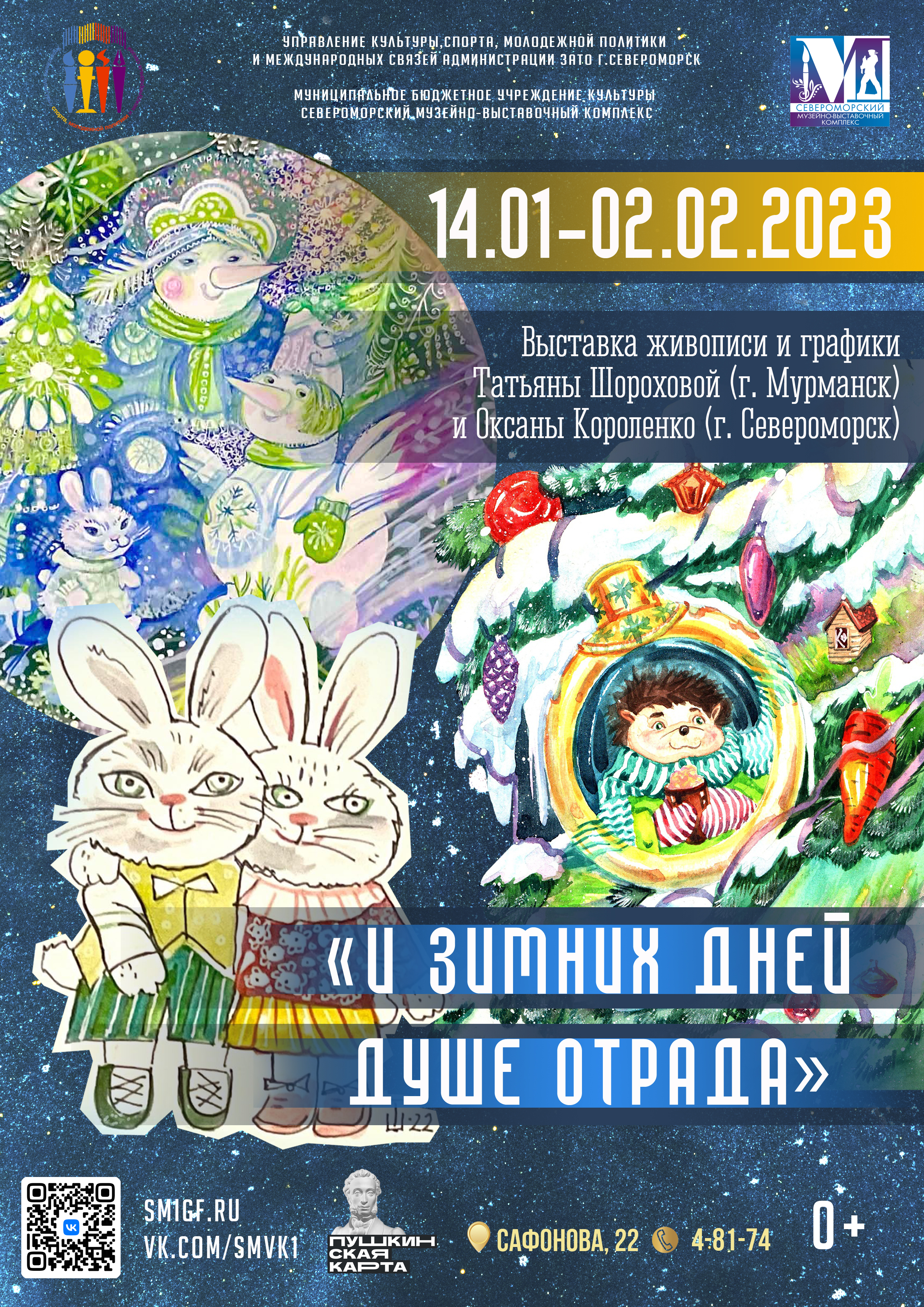 Празднично-зимняя, радостная и добрая, снежная и весёлая - это всё о выставке «И зимних дней душе отрада...» художниц Татьяны Шороховой (г.Мурманск) и Оксаны Короленко (г.Североморск). 14 января в Выставочном зале СМВК выставка открылась ярко и сказочно − благодаря актёрам ЗАТО театра. Зая и Вежа, Ёжа и Бэллочка − лесные сказочные герои добрых картин не удержались и присоединились к торжеству! Столько улыбок Выставочный зал не видел давно! Огромное спасибо талантливым актёрам и режиссёру Евгении Баркиной! Пусть открытие позади, а настроение выставки с нами осталось: на фото в альбоме СМВК https://vk.com/album-62037813_293344183);