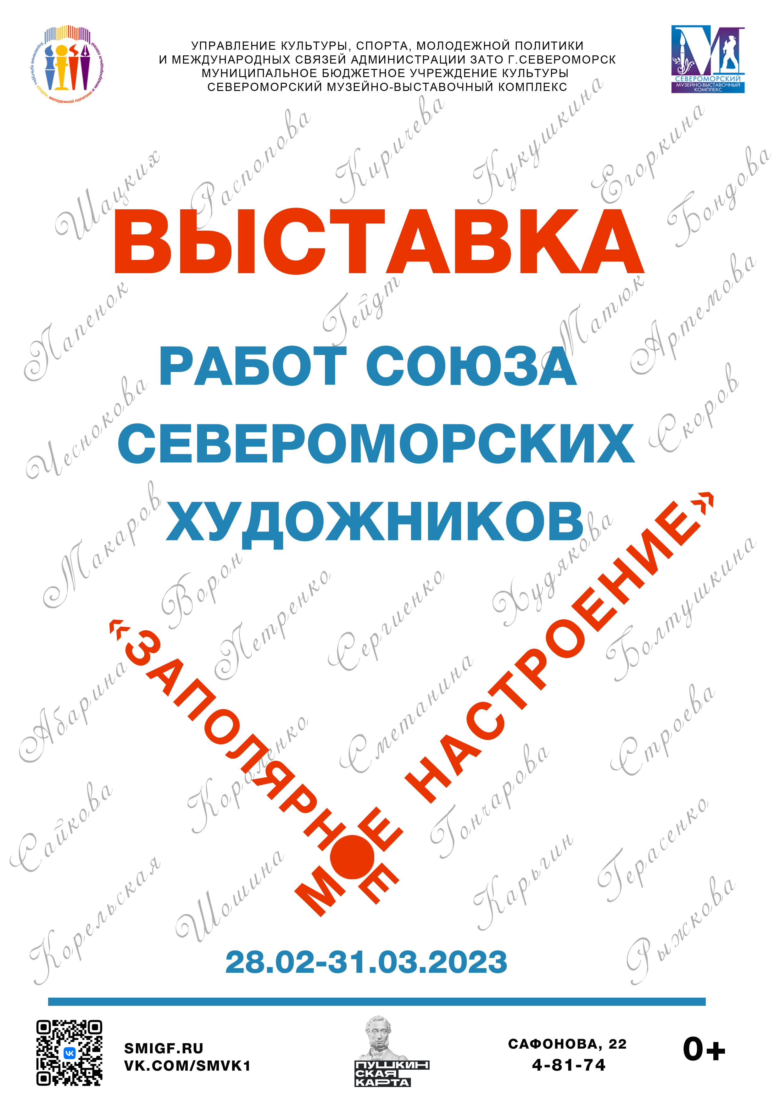 Союз художников города Североморска — любительское творческое объединение, образованное в 1993 году на базе Изостудии Северного флота по инициативе группы профессиональных художников при поддержке администрации ЗАТО г. Североморск и отдела культуры СФ. На протяжении многих лет североморские художники прославляют город своим творчеством. Члены союза провели сотни выставок в Мурманской области, отдаленных гарнизонах, во многих городах России, а также за рубежом. В экспозиции под названием «Заполярное моё настроение» представлено около 50 живописных и графических работ 30 авторов. Большая часть из них выполнена в 2022-2023 годы.Жанры, направления и сюжеты картин многообразны и позволят зрителю познакомиться с многообразием творчества талантливых художников-североморцев.