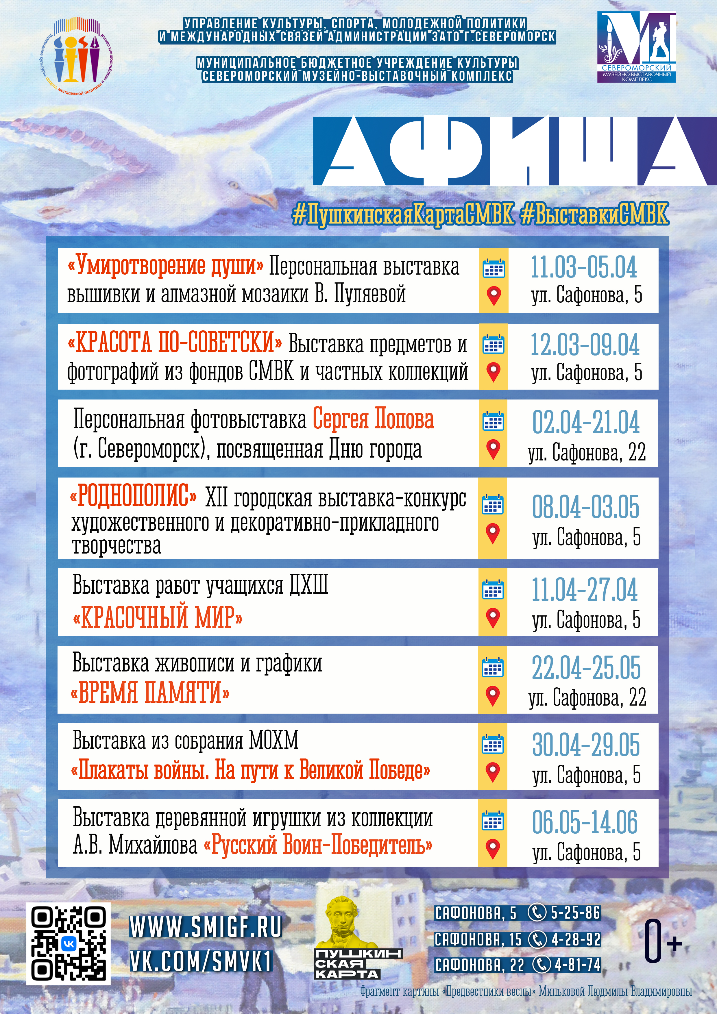Предлагаем вашему вниманию афишу ближайших выставок в Североморском Музейно-выставочном комплексе.