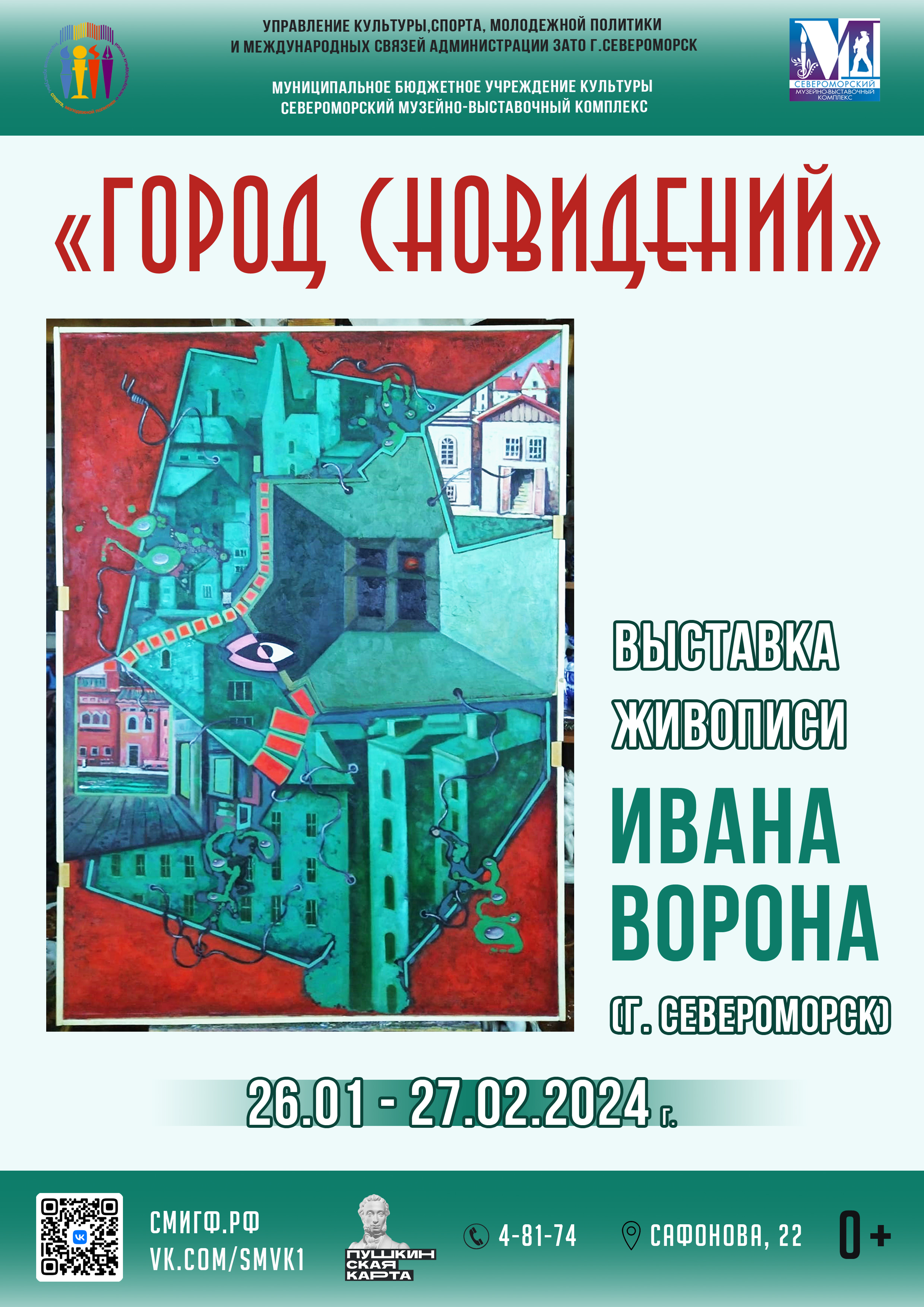 26 января в Выставочном зале СМВК состоялось торжественное открытие выставки живописи североморского художника Ивана Ворона «Город сновидений». Творчество этого автора, талантливого педагога и наставника, руководителя Изостудии СМВК хорошо известно и любимо североморцами. Со словами поздравлений с новой выставкой на открытии к Ивану Васильевичу обратился Глава ЗАТО г. Североморск Олег Александрович Прасов. Он отметил глубину представленных работ, а также активную гражданскую позицию автора. Так же художника поприветствовали председатель Совета депутатов ЗАТО г. Североморск Евгений Платонович Алексеев, и.о. Начальника Управления культуры, спорта, молодёжной политики и международных связей Мария Владимировна Злакоманова, другие гости, среди которых были друзья, коллеги, ученики Ивана Васильевича, а также юные художники − учащиеся североморской ДХШ. Выставка продолжит свою работу до 27 февраля.