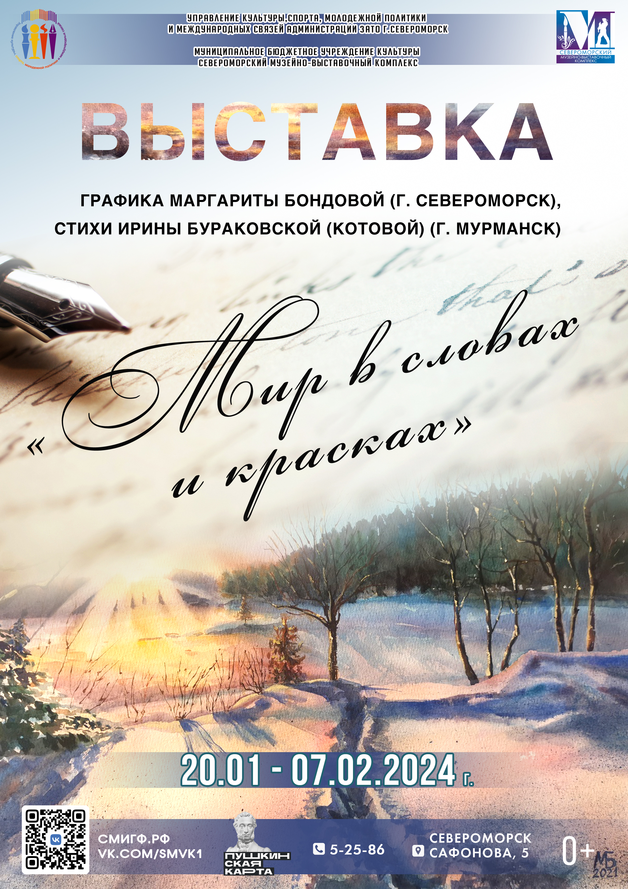 20 января состоялось торжественное открытие выставки «Мир в словах и красках», представляющей творчество художницы Маргариты Бондовой (г. Североморск) и поэтессы из Мурманска Ирины Бураковской (Котовой). Акварели североморского автора вдохновили талантливую мурманчанку − так родилось более десятка стихотворений, разных по тематике, но основанных на работах Маргариты. На открытии авторы выставки рассказали, как сложился их творческий тандем, поделились планами. Гостями торжества стали североморские и мурманские художники, друзья и близкие. Мы поздравляем авторов и приглашаем всех любителей прекрасного на выставку, которая будет работать на втором этаже Отдела ремёсел СМВК (ул.Сафонова, д. 5) до 7 февраля.