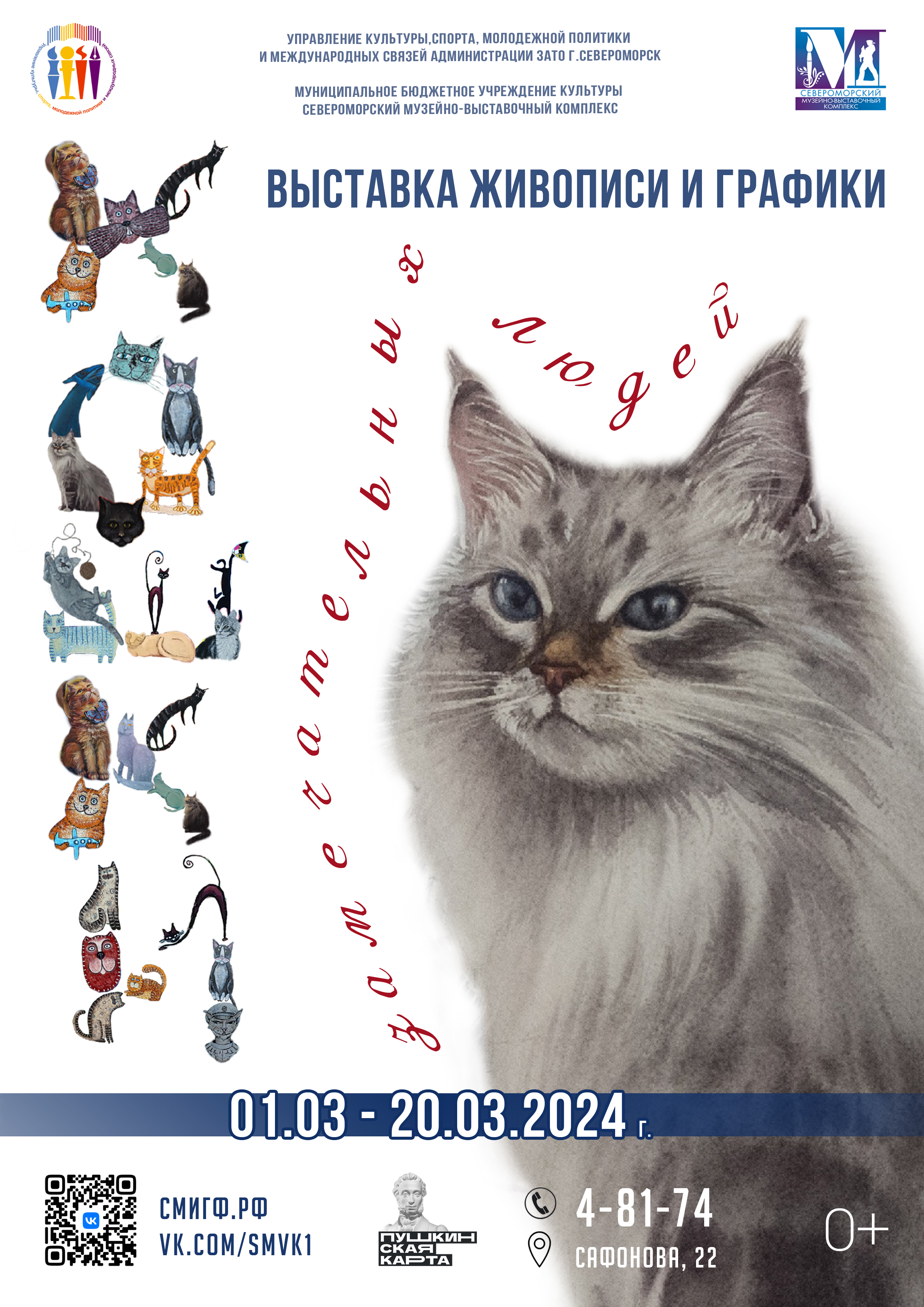 Картины участников Изостудии СМВК (руководитель Иван Ворон), североморских и мурманских художников, работы из собрания известного мурманского коллекционера Алексея Макарова − экспозиция «КОШКИ ЗАМЕЧАТЕЛЬНЫХ ЛЮДЕЙ» будет работать до 20 марта.
