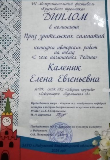 Авторская работа руководителя народного самодеятельного коллектива клуба "Северное кружево" Елены Каленик получила Приз зрительских симпатий конкурса "С чего начинается Родина".