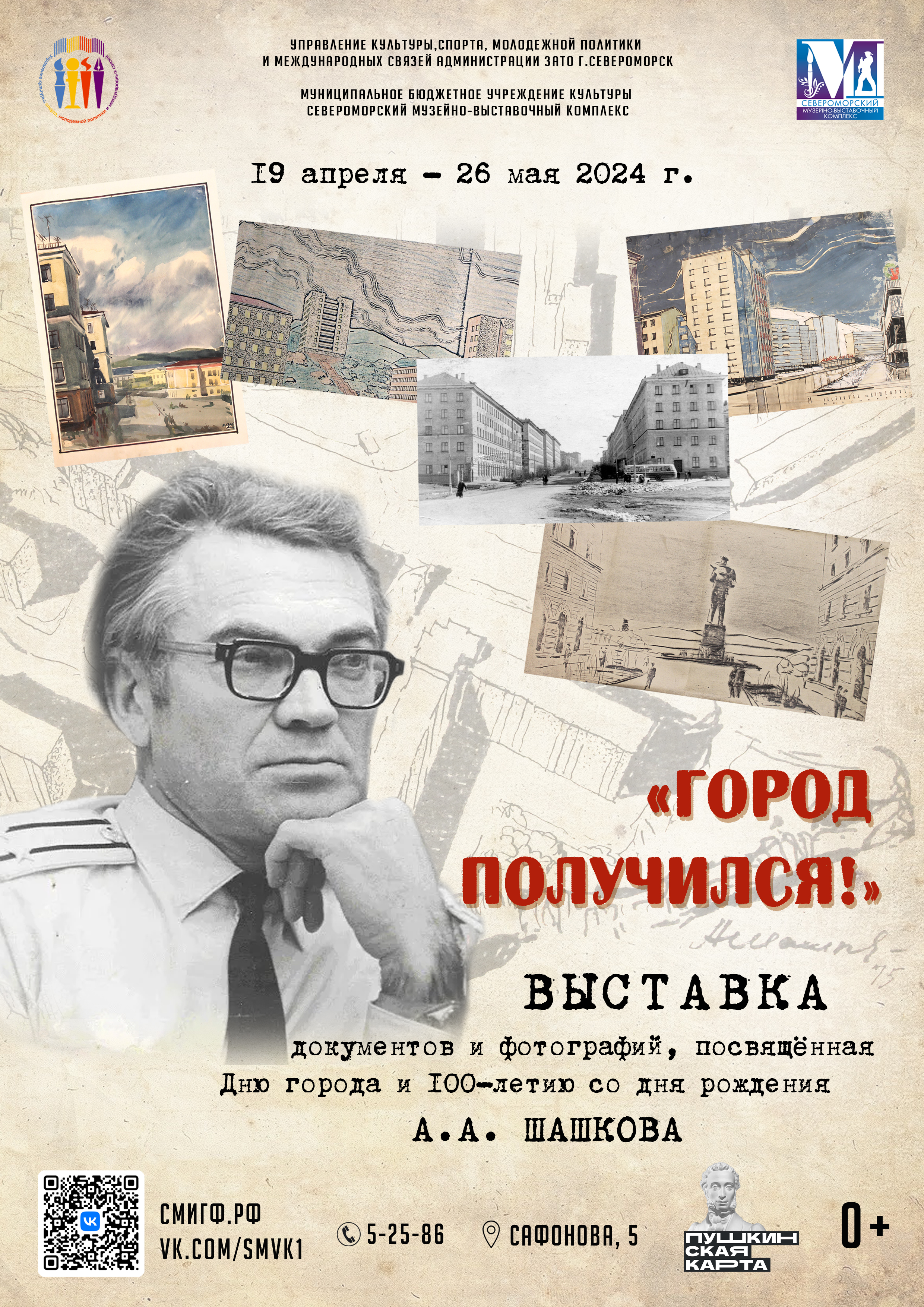 19 апреля в 15 часов приглашаем в зал временных экспозиций СМВК (ул. Сафонова, д. 5, 1 этаж Отдела ремёсел) на торжественное открытие выставки «Город получился!», посвящённой Дню города и 100-летию Анатолия Алексеевича Шашкова.