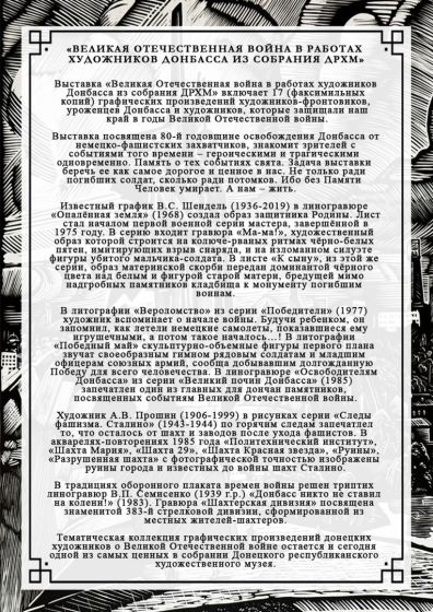 Выставка посвящена 80-й годовщине освобождения Донбасса от немецко- фашистских захватчиков. На выставке представлены печатные репродукции произведений донецких художников: В.С. Шенделя, Р.Ф. Ефименко, А.В. Прошина, В.П. Семисенко, П.М. Супонина. Работы стали частью экспозиции «Героями не рождаются − героями становятся», посвящённой защитникам нашей Родины в годы Великой Отечественной войны и современным героям − участникам специальной военной операции.