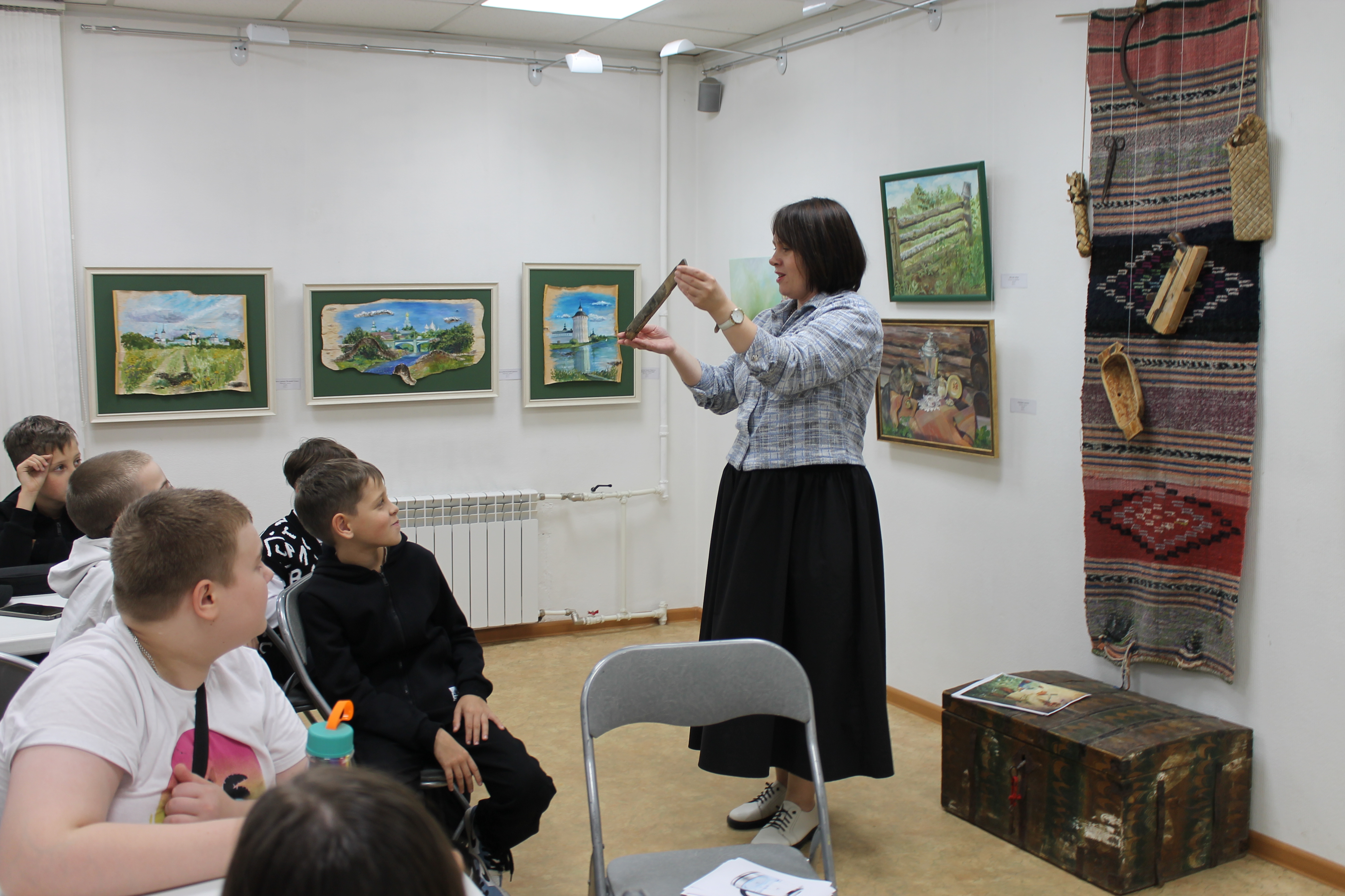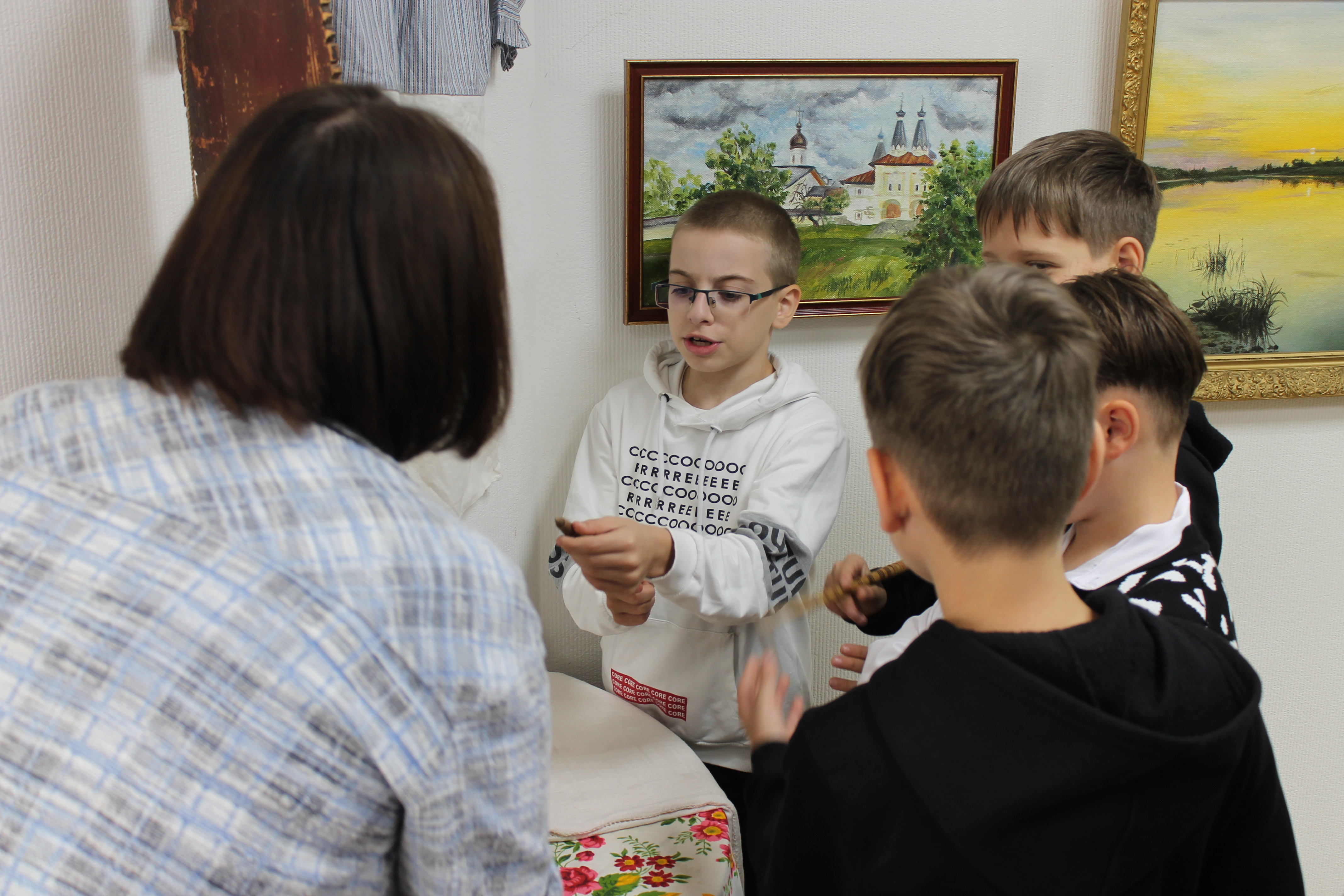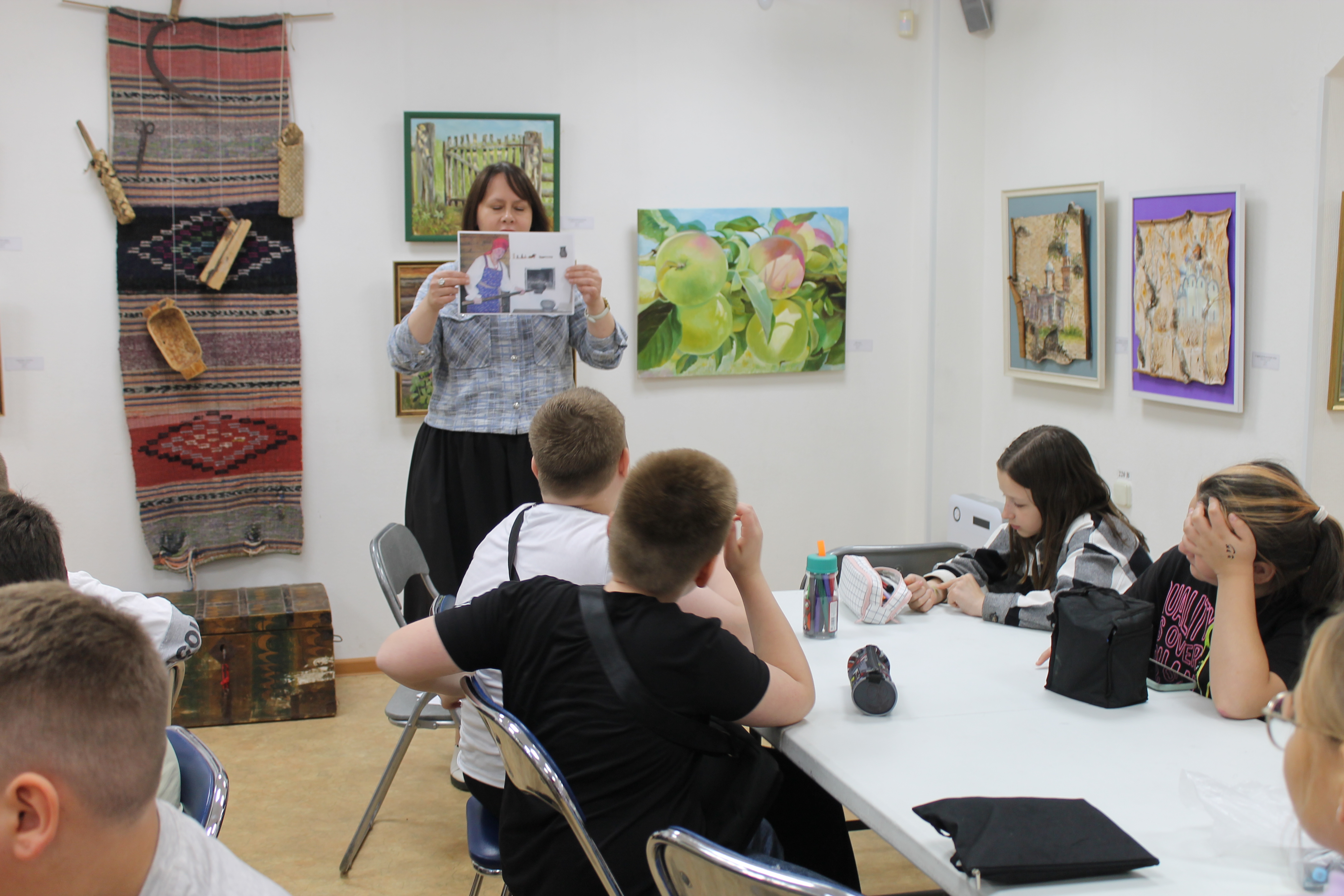 В Выставочном зале побывали ученики 5 «А» класса школы №7 со своим классным руководителем. Увидеть картины на бересте, деревенские пейзажи, предметы, которыми пользовались наши предки, узнать, как они работали − все было интересно! Приоткрыть крышку старинного сундука, оценить вес утюга, которым ловко пользовались прабабушки, понять, как работал самовар...Музейное занятие погружает в жизнь наших предков!