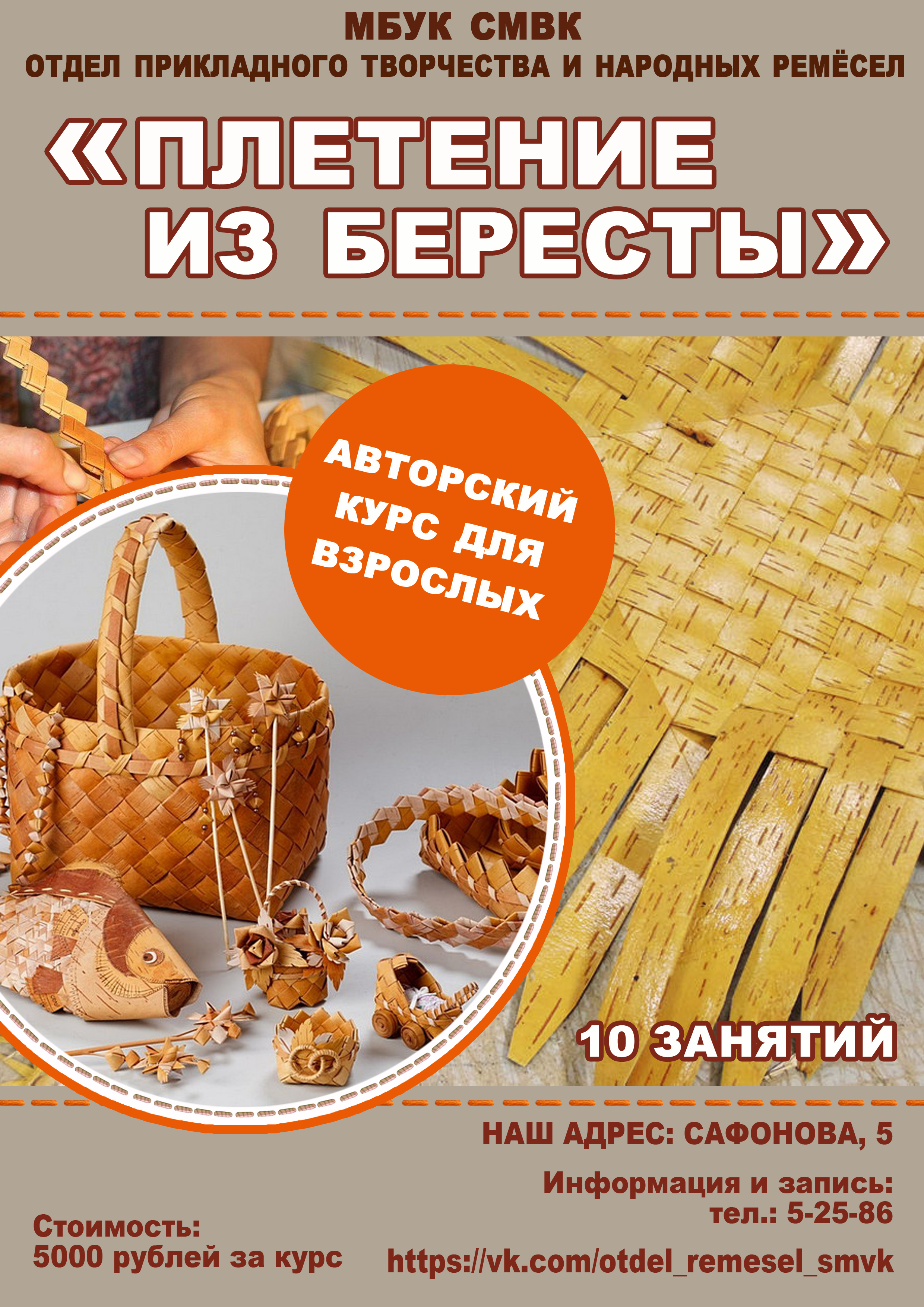 Сегодня, 9 ноября, в 16.00 в Отделе ремёсел МБУК СМВК начнётся первое занятие курса «Плетение из бересты».