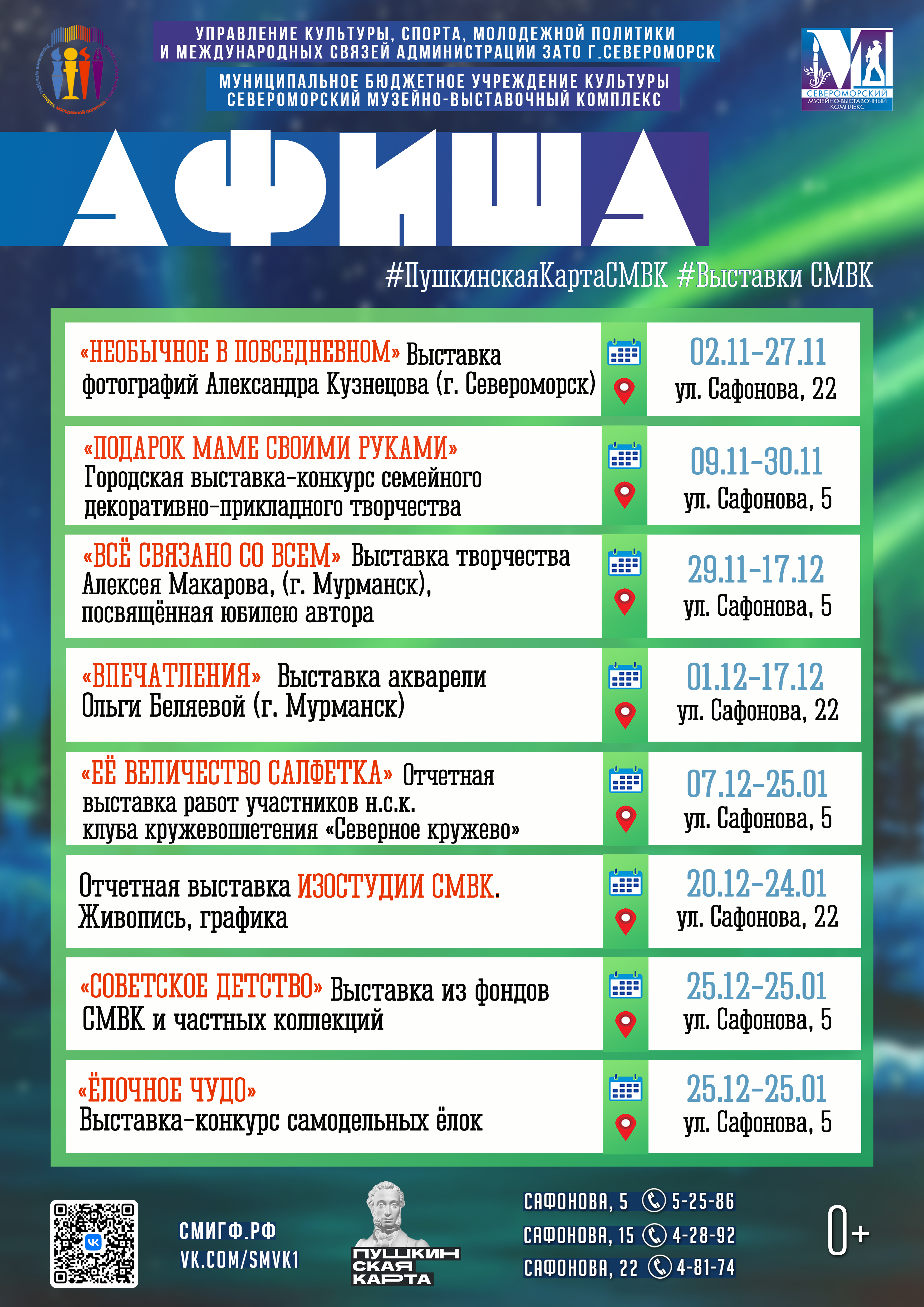 Представляем вашему вниманию афишу ближайших выставок в Североморском Музейно-выставочном комплексе. Будем рады видеть вас в числе наших посетителей!