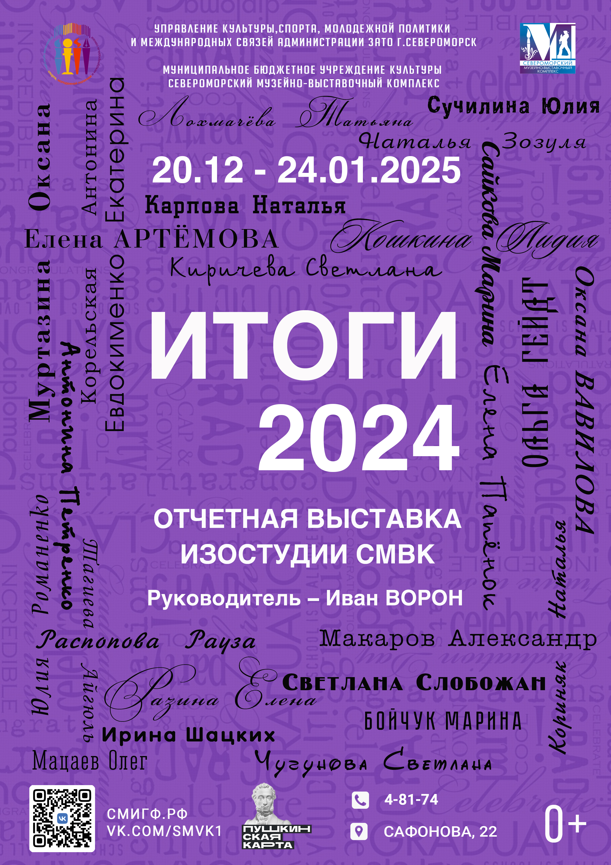 20 декабря в Выставочном зале СМВК ( ул. Сафонова, д.22) состоялось торжественное открытие отчётной выставки участников Изостудии СМВК "ИТОГИ 2024". Талантливые североморцы и мурманчане, занимающиеся под руководством известного североморского художника Ивана Васильевича Ворона, представили свои новые картины. Экспозиция получилась очень насыщенной - в зале размещены более 70 работ!