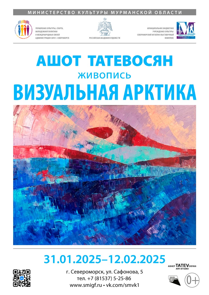 31 января 2025 г. в 17:00 в зале временных экспозиций Североморского Музейно-выставочного комплекса (по адресу: г. Североморск, ул. Сафонова, 5) состоится открытие юбилейной, в честь 40-летия творческой деятельности, персональной выставки и творческий вечер члена-корреспондента Российской Академии Художеств Ашота Татевосяна (TATEВ). На выставке будут представлены живописные работы Татевосяна А. Г. — такие арт-проекты как «К НОВЫМ СОЛНЦАМ», «СЕВЕРНЫЕ ЭТЮДЫ», «ВИЗУАЛЬНАЯ АРКТИКА», выполненные за три года творческой жизни за Полярным кругом. Творческий вечер включает в себя презентацию монографии автора«Северные этюды. Особенности архитектуры Арктики: история, традиции, перспективы».