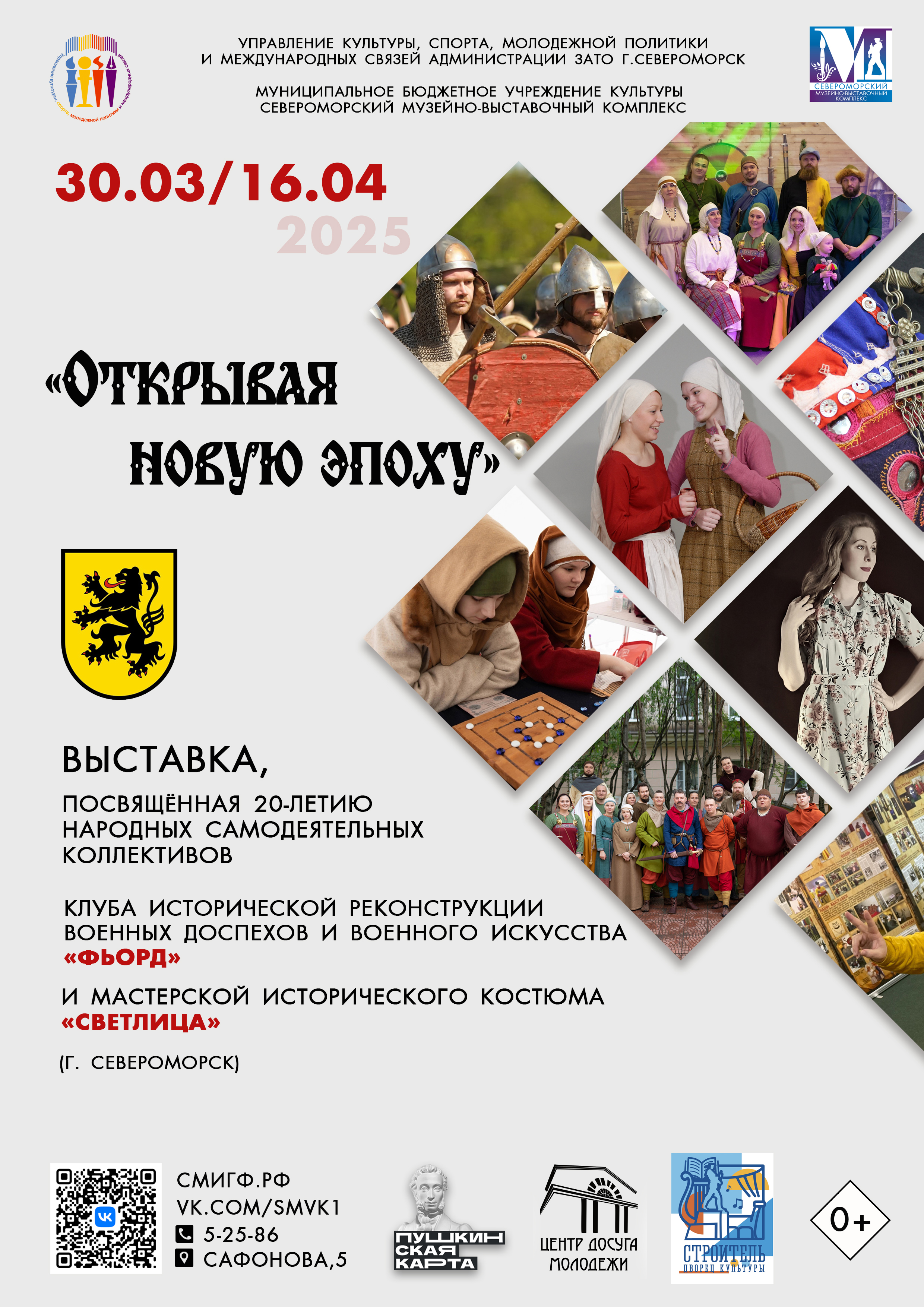 В отделе прикладного творчества и народных ремёсел Североморского музейно-выставочного комплекса открылась выставка, посвящённая 20-летию народных самодеятельных коллективов клубов исторической реконструкции «Светлица» и «Фьорд» (Центр досуга молодёжи). Североморские реконструкторы назвали свою экспозицию «Открывая новую эпоху» и на её открытии рассказали об истории и основных направлениях деятельности коллективов, познакомили посетителей с костюмами, украшениями и предметами быта, которые своими руками изготовили участники коллективов, основываясь на различных исторических источниках.