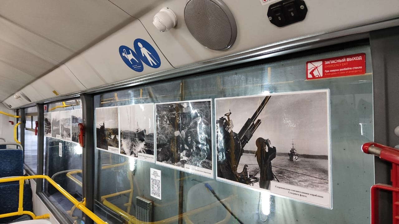 Несколько автобусов оформлены фотографиями, посвященными разгрому немецко-фашистских войск в Заполярье.