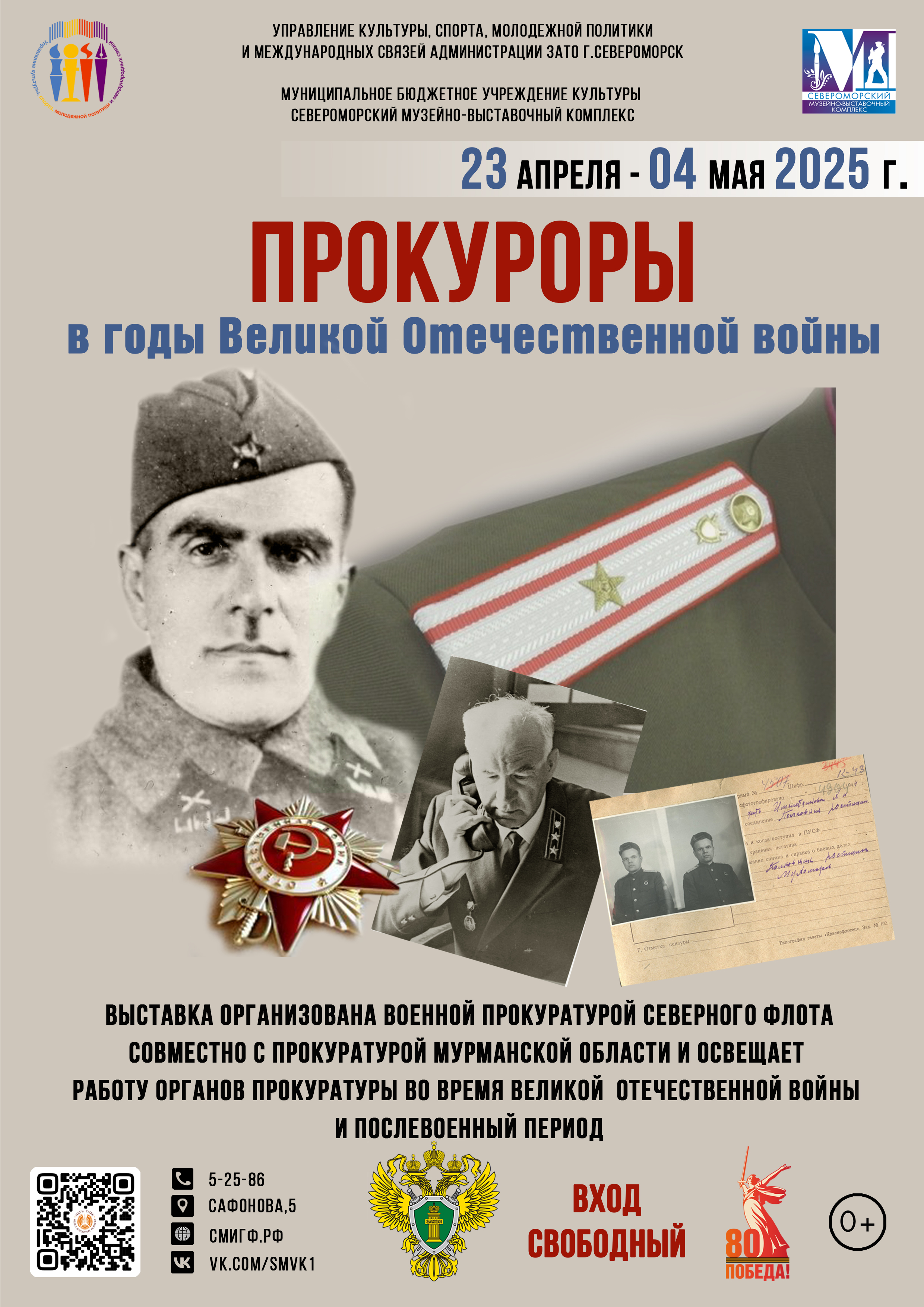 К 80-летию Победы в Великой Отечественной войне в Североморском Музейно-выставочном комплексе начала работу выставка, организованная военной прокуратурой Северного флота совместно с прокуратурой Мурманской области. Историко-документальная выставка рассказывает посетителям о работе прокуроров в годы Великой Отечественной войны и в послевоенный период.