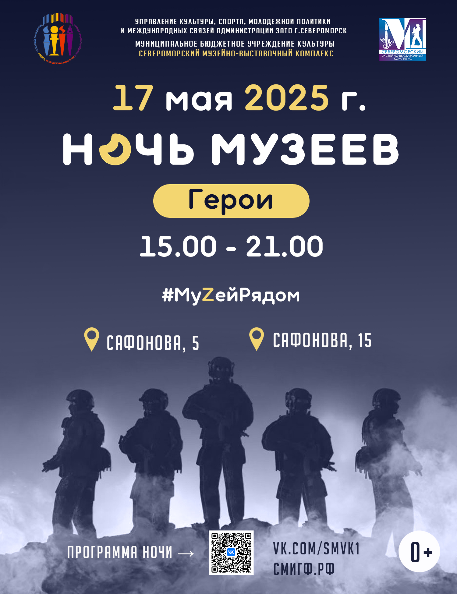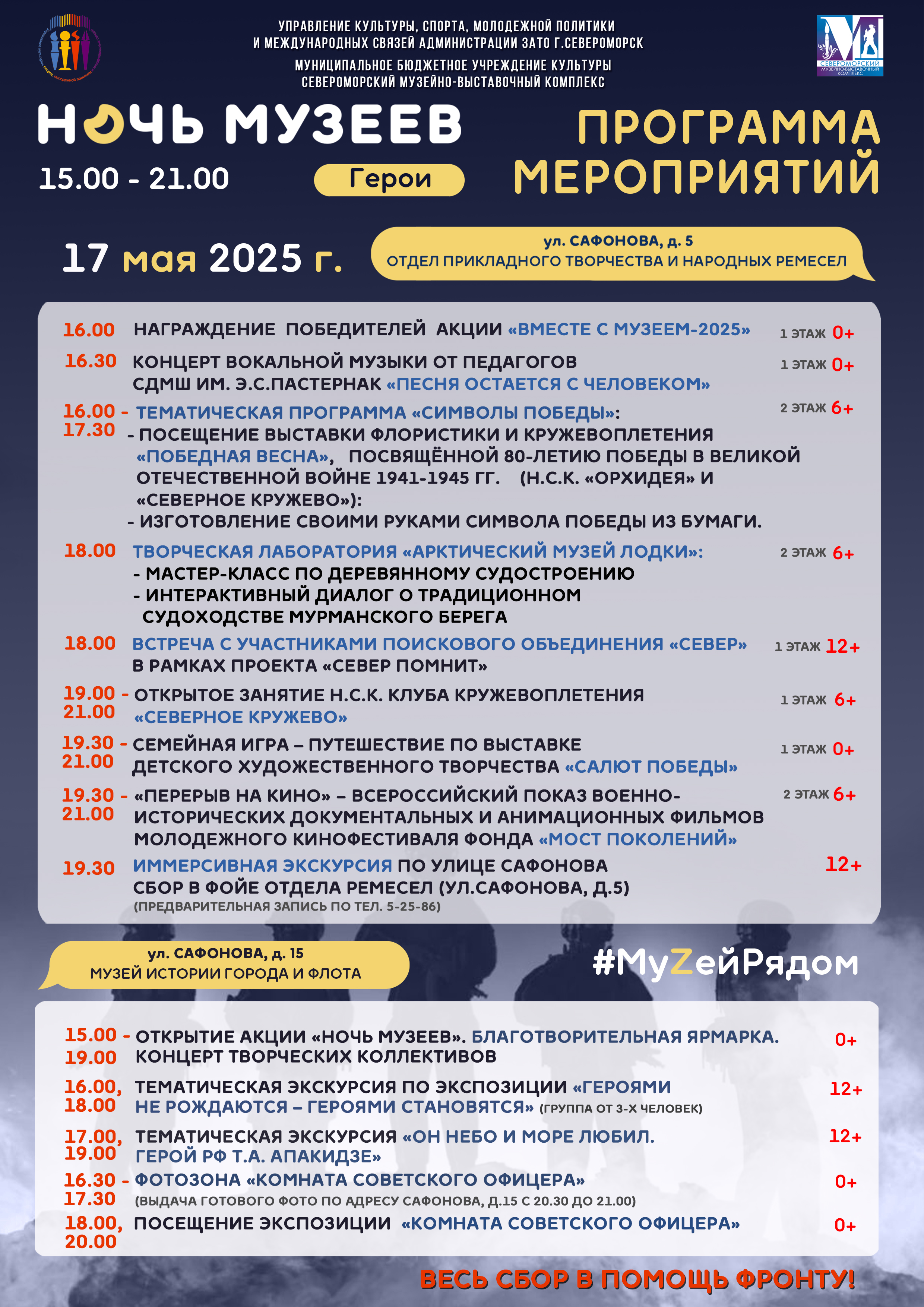 С 16.00 в Отделе ремесел на Сафонова, д.5 − концерт вокальной музыки от педагогов Детской музыкальной школы им. Э.С.Пастернак , встреча с поисковиками объединения «Север», семейная игра-путешествие по выставке детского творчества «Салют Победы» , экскурсии и мастер-классы!