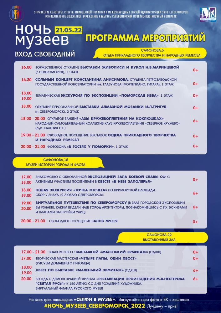 Предлагаем Вашему вниманию программу мероприятий, которые состоятся в рамках Всероссийской акции «Ночь музеев» Североморского Музейно-выстовочного комплекса