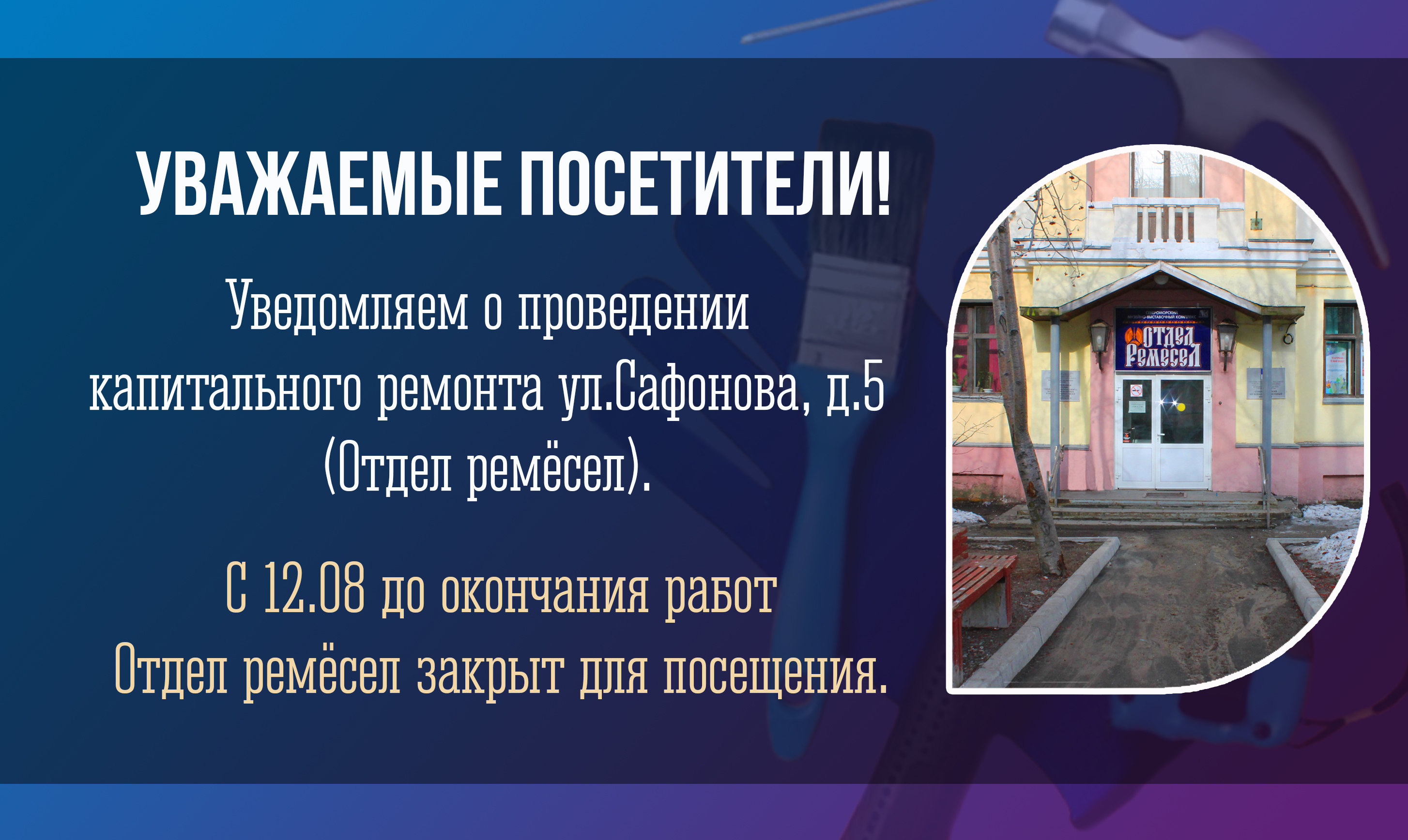 С 12 августа до окончания работ Отдел ремёсел закрыт для посещения.