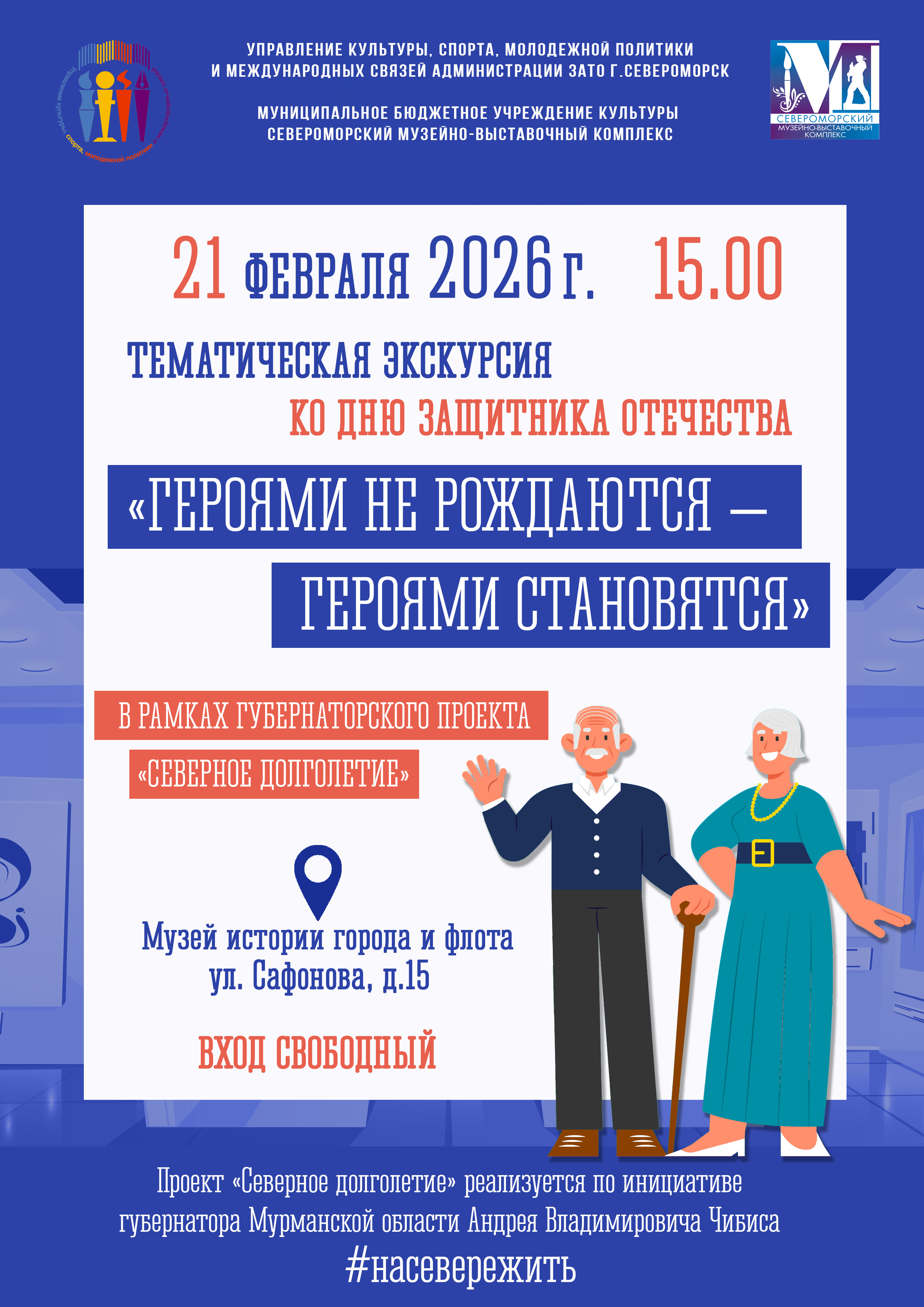 В рамках губернаторского проекта «Северное долголетие» приглашаем людей старшего поколения 21 февраля 2026 года в 15.00 на экскурсию «Героями не рождаются – героями становятся». Экскурсия проводится в Музее истории города и флота по залу Героев-североморцев, где представлена история Великой Отечественной войны 1941-1945 гг. в Заполярье и материалы, посвященные самоотверженности, героизму и мужеству российских военнослужащих и добровольцев, проявленным в ходе специальной военной операции.